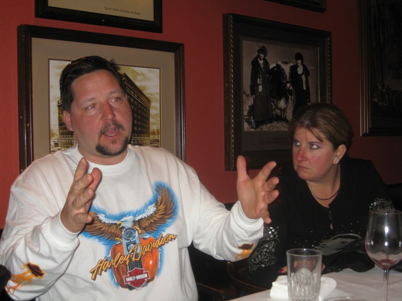 2007 CVO Rally for no good reason! On Friday April 6, 2007, I loaded the bike into the trailer and hauled it to meet Anne in New Jersey where we would start our trip. On Saturday morning we awoke to cold weather and a questionable forecast but elected to continue with our plans. Our goal for the day was to ride across Pennsylvania down into Maryland and across West Virginia with the intent of spending the night in Charleston, WV. As the day progressed we had the occasional snow flurry and then some heavier but quick snow showers. As the day grew later we decided to not to push through to Charleston but instead stopped about 120 miles early in Clarksburg, WV. We did manage to stop at four Harley Dealers along the way for the required t-shirt. I washed the bike and covered it for the night hoping for a nicer day on Sunday. We went to a nice dinner at the place right next to our hotel. Easter Sunday, we woke up and to our surprise found an inch of show on the ground and on the bike! Once out of the parking lot the roads were treated and relatively clear so we took it easy and finally made it to Charleston where the weather started to clear and by the time we made it to Lexington, KY it was downright nice but still cool. From there we continued south making our planned destination of Nashville, TN. Since it was Easter Sunday, neither of the two Harley dealers that we intended to stop at were open. The bike was covered in road salt but no car wash was nearby. I used a towel and a bucket to get some off but I refused to take a picture of the mess! We spent the evening sampling the local brews and food fare around the music row area managing to return to our hotel. Monday morning we woke to a beautiful day and started our way to the end/start of the Natchez Trace Parkway just south of Nashville. This was suggested by Harvey when we were visiting him and Jordine last November. We rode the Trace for about 120 miles where we exited to stop at the Harley dealer near Muscle shoals. I also was able to was the salt off the bike at a nearby car wash. We then returned to the Trace to continue the ride south. We then crossed into Mississippi and continued down the Trace all the way to Jackson where we stopped at the local Harley shop. At that point, we left the Trace and continued west to Vicksburg where we planned to spend the night. If we had more time, the Civil War battlefield at the National Park would have been on the itinerary. The next day, Tuesday, we started west across the Mississippi River and into Louisiana. Stopping at a couple of Harley dealers along the way it was a sometimes wet ride until we reached Shreveport. From there, we headed north in the sun to Texarkana, Texas and then east towards Hot Springs Arkansas where we backed into the same rain we were earlier traveling. The Hot Springs Harley dealer was closed so we continued north up route 7 to our destination for the night, Russellville. We stopped at a local BBQ joint, the Big Red Drive-In, owned by some friends of ours, Mike and JoAnn. This is where the trip took it's most devastating turn....Russellville is in the center of a DRY County! This meant no BEER with dinner...I was crushed. Mike and JoAnn however treated us to a wonderful dinner and their great company made up for the lack of adult beverages. Wednesday morning, we left with the sun rising and expectations for a pleasant day of travel. We headed west to Tulsa, Oklahoma and then northeast on Historic Rt. 66 to Joplin Missouri. From there we went north towards Kansas City. About ten miles from the hotel, I had a Shifter Linkage problem with the bike and after some roadside repairs was able to limp to the Hotel mostly in third gear. At the hotel I called a nearby Harley dealer to see if I could come in for service in the morning to repair the shifter. Gail's HD was great and said to be there at 9 in the morning and they would work the issue. That evening we then walked down to a restaurant called the Hereford House where I had a GREAT STEAK! The next morning, the weather forecast for the weekend was not looking good...with more snow expected anywhere from KC to the Ohio valley...basically, the way home. Our plan was to ride to Nebraska and Iowa on Thursday, dinner with some friends Thursday Night, the Factory Tour on Friday and then ride home Saturday and Sunday. Well, when looking at everything, timing and weather especially, we changed our plans. We went to Gail's and had the bike fixed and then proceeded to ride around the area stopping at the Harley factory. After leaving the factory, we put our alternate plans into action. We stopped at the airport where we rented a car for a one-way trip to New Jersey. We then dropped the bike off at Gail's and returned to the hotel in the rental car. At the hotel, we met up with some of our KC friends to head out to dinner.